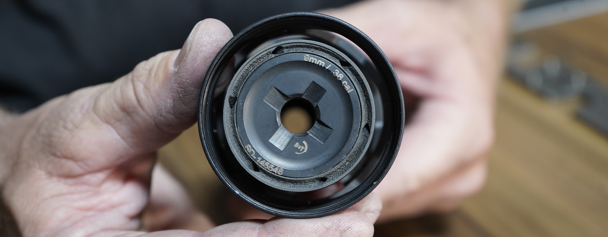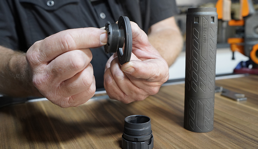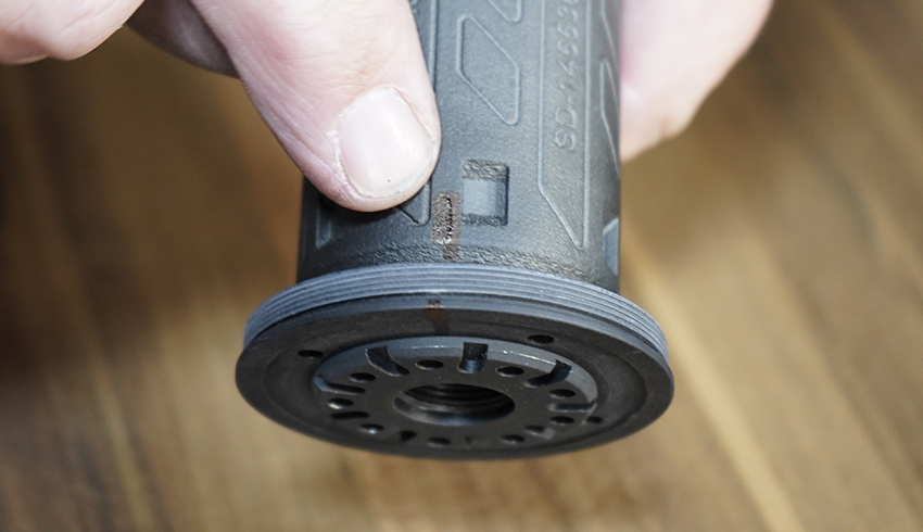 Install the HUB mount with the Kryon H adapter onto the suppressor body. Make sure to center the Kryon H adapter before tightening. (Photo below shows suppressor not centered)