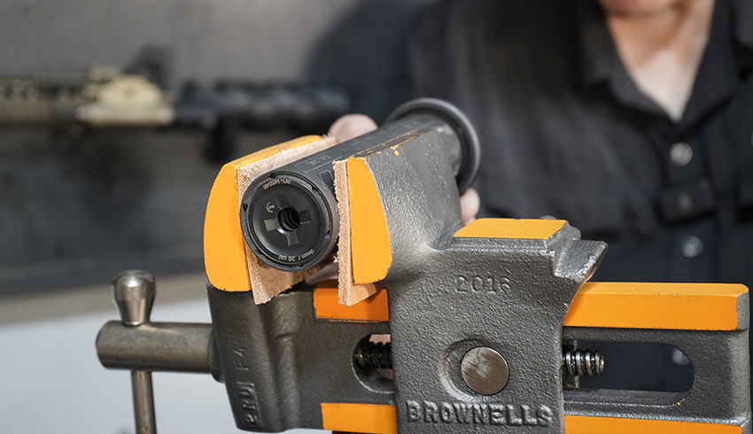 Using a padded vise or leather strip on vise jaws to protect suppressor will assist in removal. (Some suppressors come with two spanners to remove the HUB mount without a vice).